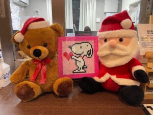 そこで、正面入り口にぬいぐるみと、入居者様が作成したアイロンビーズを展示しました。