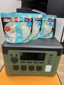 お米や水、ポータブル充電器も準備しています。